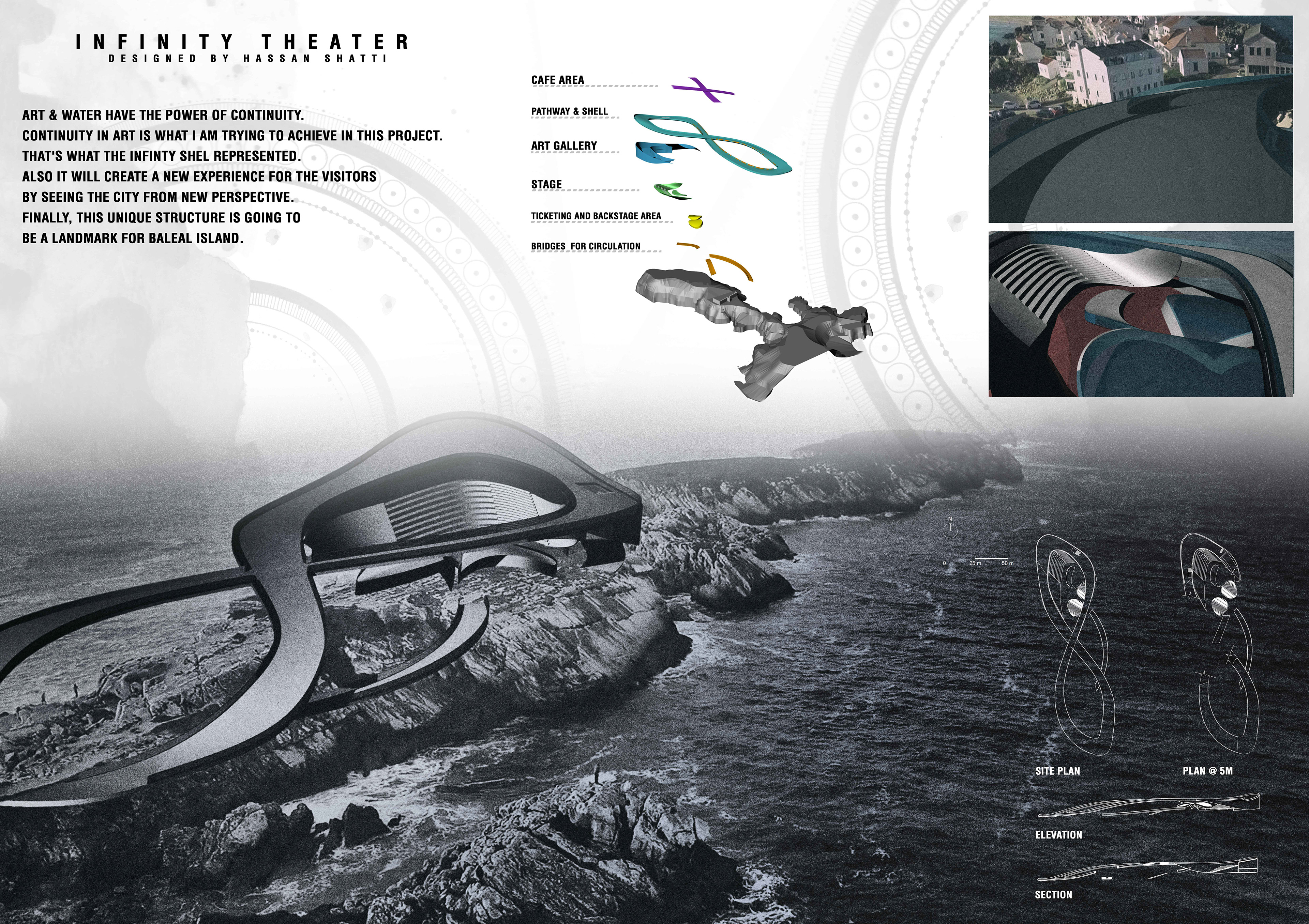 ARC 201 The task was a competition to design an outdoor theater in Baleal, a historic island in Portugal. An attempt to create a new public space, bridges going above the ruins and around them. These bridges also continued to form the theater + They give the people of the island new view points. Keeping the landscape of the historical island was one of the reasons that formulate the concept of the bridges that started from the beginning of the island leading you in a journey towards the end where you will find the gallery and the theater.